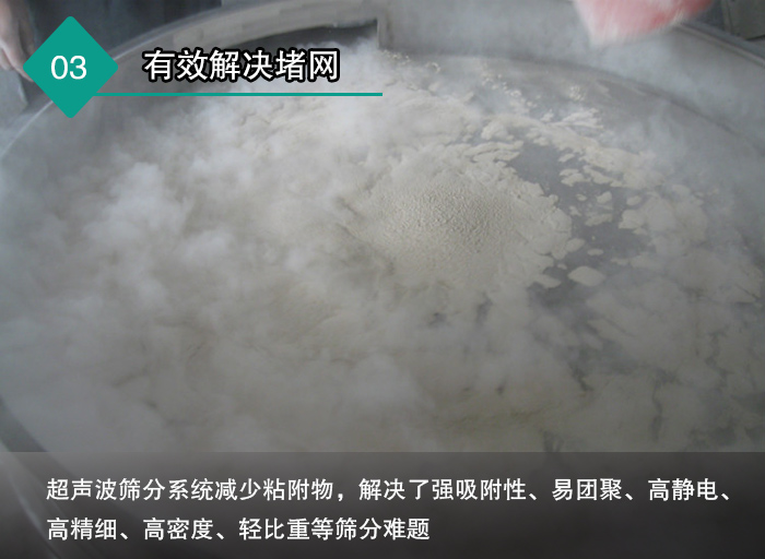 超聲波篩分系統(tǒng)減少粘附物,解決了強(qiáng)吸附性、易團(tuán)聚、高靜電、高精細(xì)、高密度、輕比重等篩分難題。