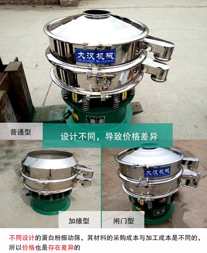 每個用戶的需求是不一樣的,所以大漢針對此種情況,對蛋白粉振動篩進行不同設計,大化貼近用戶的實際需求,例如:層數(shù)上分為1~5層,結構上分為直卸式、閘門式、加緣式等等,對于廠家而言,不同設計的蛋白粉振動篩,其材料的采購成本與加工成本是不同的,所以價格也是存在差異的。