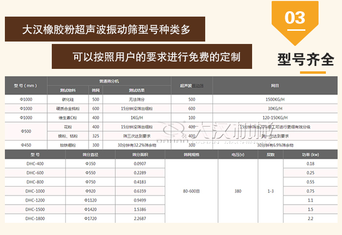 大漢橡膠粉超聲波振動篩型號種類多,主要包括DHC400,DHC600,DHC800,DHC1000,DHC1200,DHC1500,DHC1800,可以大化滿足用戶的的生產(chǎn)需要。